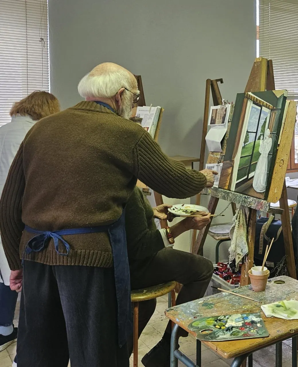 L’atelier de peinture du Comm (Créations originales manuelles et multiples) accueille une douzaine de personnes, fidèles de ce cours dispensé par Michel Guérard depuis 1983. Certaines sont là quasiment depuis les débuts, d’autres l’ont intégré plus tard.  Nous apprécions sa façon de nous guider tout en nous laissant libres de nos sujets. Nous avons le choix entre la peinture à l’huile ou à l’acrylique, mais il est aussi possible de ne faire que du dessin. Il nous a fait progresser au fil des années dans une ambiance toujours agréable. Notre cours de peinture, c’est devenu un rendez-vous incontournable où se sont liées des amitiésÂ
