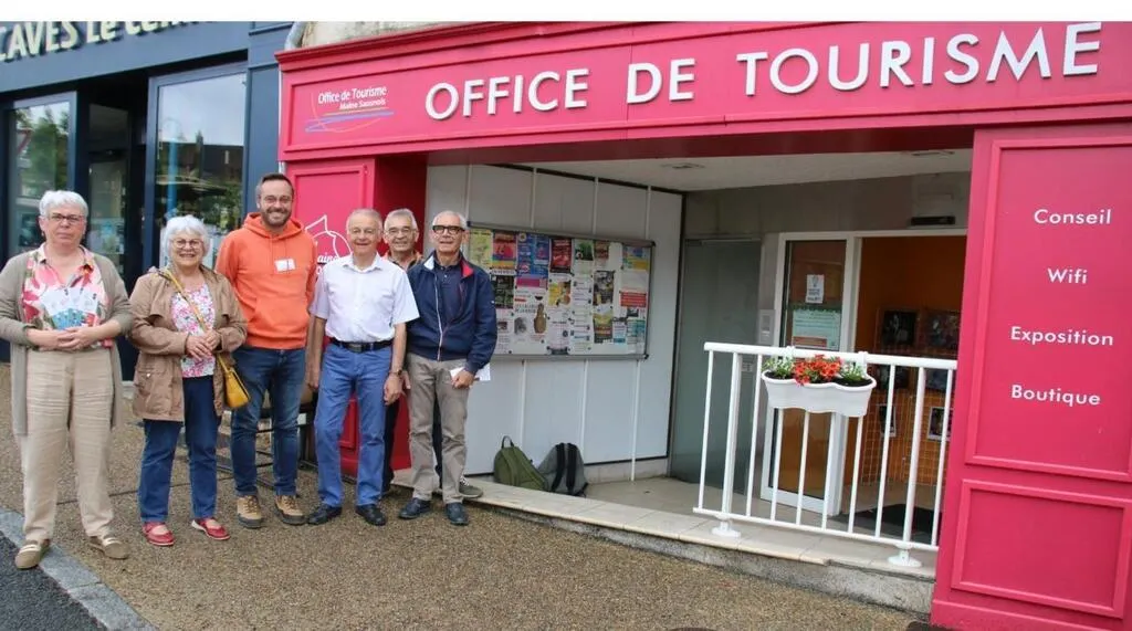 Bernard Seille, (à droite), accompagné à sa droite de Dany Chanroux, retraité de la Caisse d’Épargne, Jean-Louis Charrier, historien local, Fabien Katitsch, guide conférencier de l’office de tourisme Maine Saosnois (OTMS), Yvette Sourdille, la présidente de l’OTMS et Brigitte Hérisson, directrice. © Ouest-France