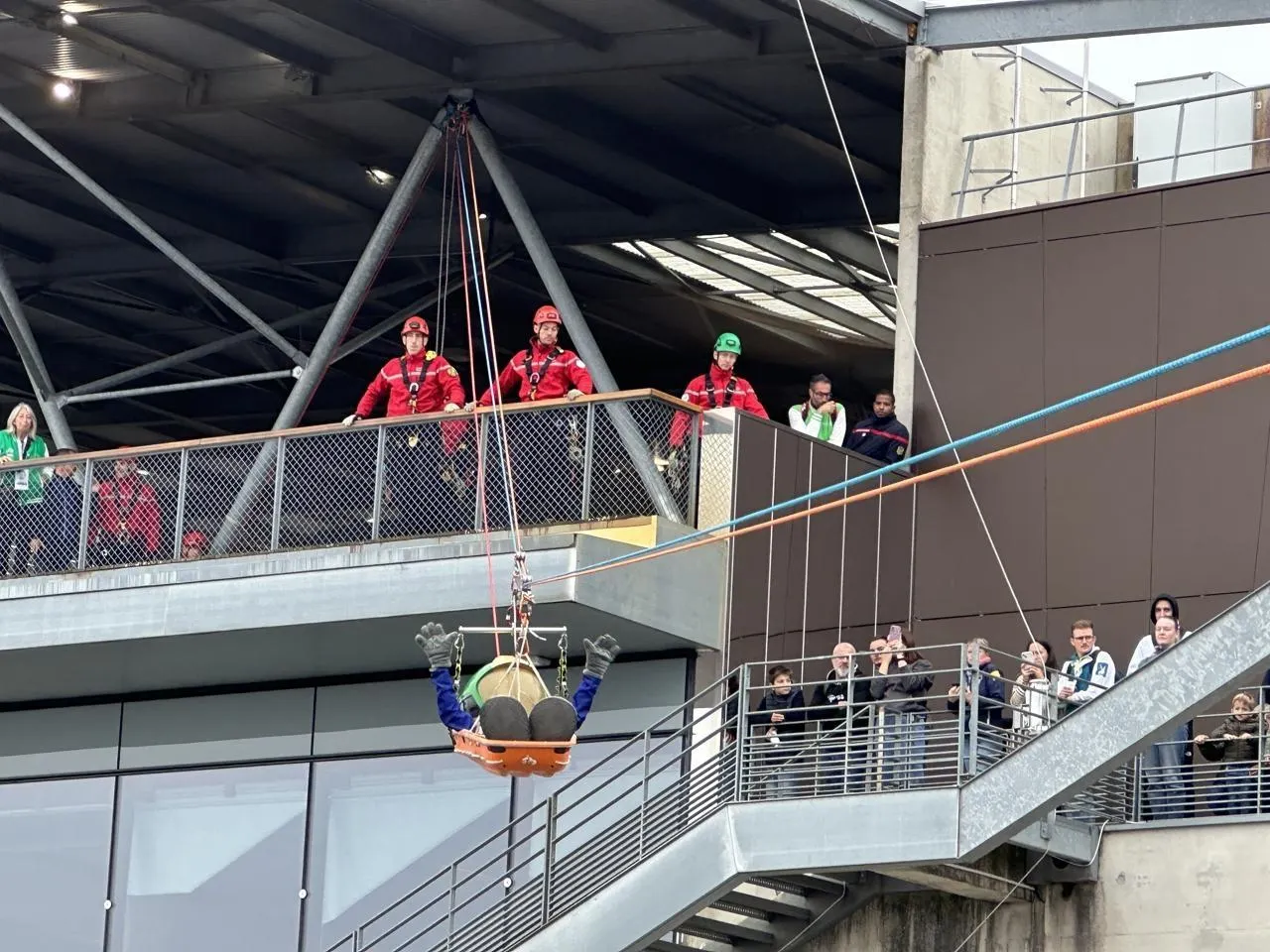 Pour une animation, la mascotte « Pompilote » du congrès national des sapeurs-pompiers au Mans a été brancardée sur cordes par l’équipe sarthoise du SMP (secours en milieu périlleux). © Ouest-France