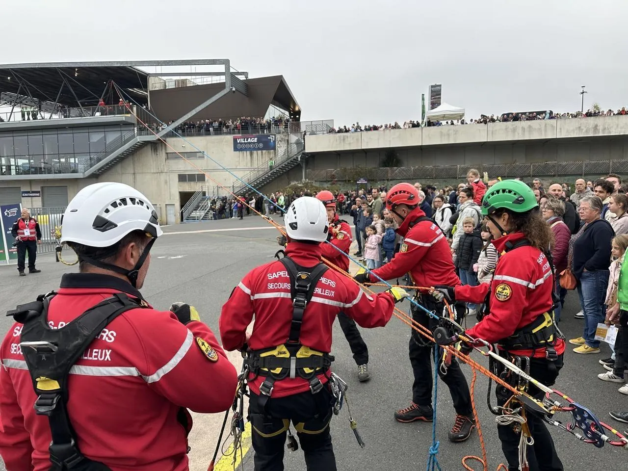 L’exercice séduit le public. Petit tour en barquette, façon sauvetage, pour la mascotte « Pompilote » du congrès national des sapeurs-pompiers au Mans. Elle a été descendue via des cordes par l’équipe sarthoise du SMP (secours en milieu périlleux).