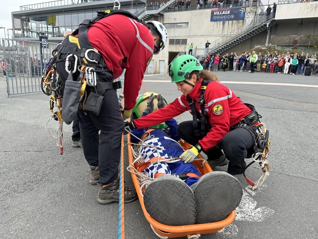 Manœuvre au congrès national des sapeurs pompiers au Mans : la mascotte en civière et dans les airs... |