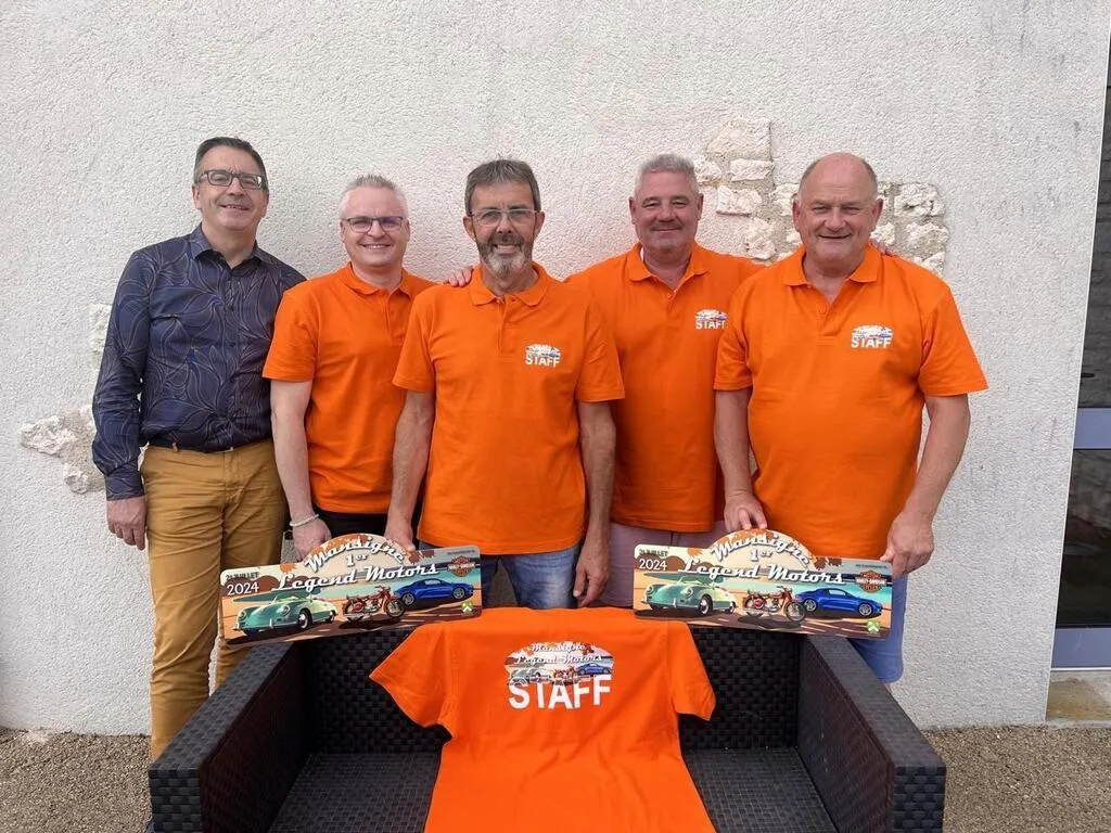François Boussard, maire de Mansigné ; José Loyer, Dany Dupuy, Laurent Goubet et Pascal Habert, les organisateurs du premier Mansigné Legend motors ; qui se déroulera dimanche 21 juillet 2024, au lac de Mansigné (Sarthe). © Ouest-France