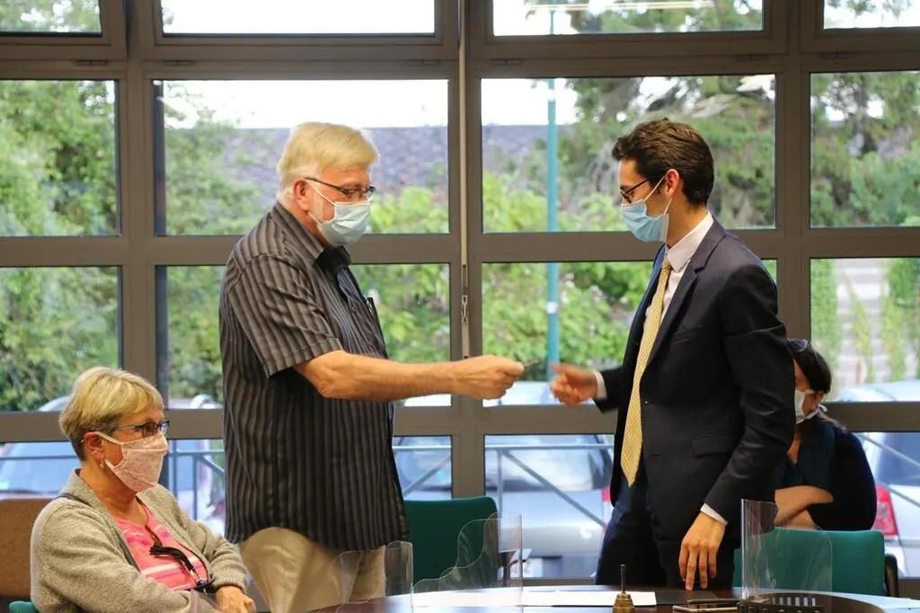 Pierre Houdayer a remis sa clé de mairie à Jérôme Prémartin, vendredi. © ouest-france