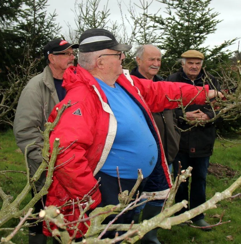 Il faut raccourcir les branches en février. « L’arbre ne doit pas faire du bois mais des fruits. Donc on distingue les bourgeons ronds à fruit des bourgeons pointus et l’on dégage le centre de l’arbre parce qu’il lui faut de l’air » indique Robert Jamin, à la quinzaine de personnes venues à son cours en plein air.