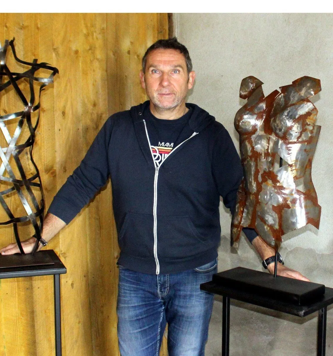 Ludovic Gaudrée, 53 ans, a créé il y a trois ans son atelier d’artisan créateur à Marigné-Laillé. « Recycler, fabriquer, créer avec passion c’est ce pour quoi je me lève le matin. Mon atelier est un espace où le métal se transforme en bustes, en luminaires, en œuvres sensibles et expressives. J’aime faire dialoguer la rudesse du matériau avec la douceur des formes, faire surgir des reflets et des éclats inattendus. Ce qui m’anime ? C’est la matière, bien sûr, mais aussi le geste, les textures, et ce lien invisible entre art et artisanat. » Spécialisé dans la métallerie ses réalisations sont variées, mobilier sur mesure, décoration, lampes, escaliers… « Maintenant ma conjointe, Nathalie, réalise des abat-jour et des cyanotypes qui complètent notre offre » ajoute-t-il. Le cyanotype est un procédé photographique monochrome négatif ancien, qui permet d’obtenir un tirage photographique bleu de Prusse, bleu cyan précisément, du plus bel effet.