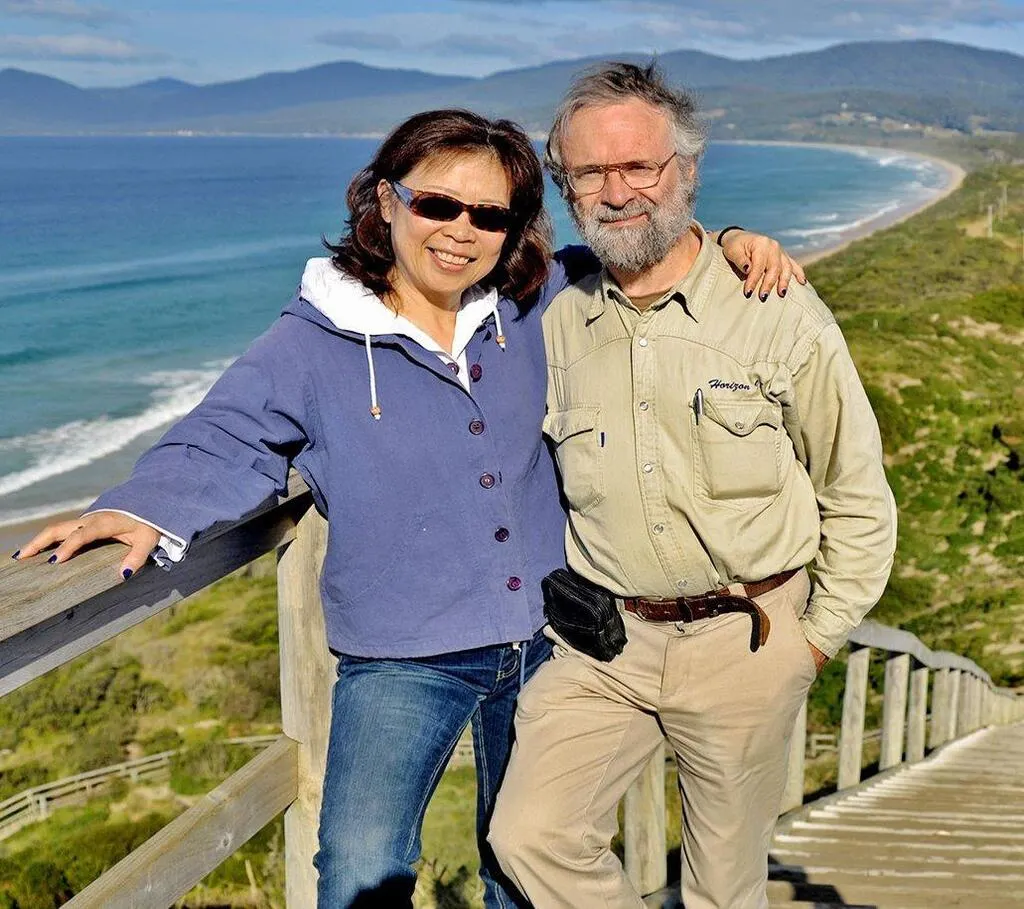 Jean Charbonneau et son épouse Wei Dong en Tasmanie, sur le neck de Bruny Island. © Jean CHARBONNEAU