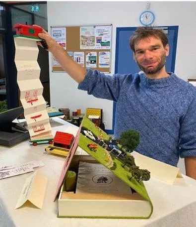 Des livres objets sont créés par Alain Briand, relieur décorateur qui fait de la création et de la restauration. Frédéric Gaboyer, le responsable de la médiathèque de Mayet explique :  Nous découvrons toutes sortes de livres, comme, par exemple ce coussin qui s’ouvre et contient un livre. Avec des briques de Lego (notre photo), il a créé un véhicule qui s’ouvre également. Il a réalisé un code de la route dans une version normande. Les livres exposés sont pour la plupart, des rébus. Il y en a beaucoup. C’est assez difficile à expliquer, il faut venir découvrir les Å“uvres et être patient pour en comprendre toutes les subtilitésÂ