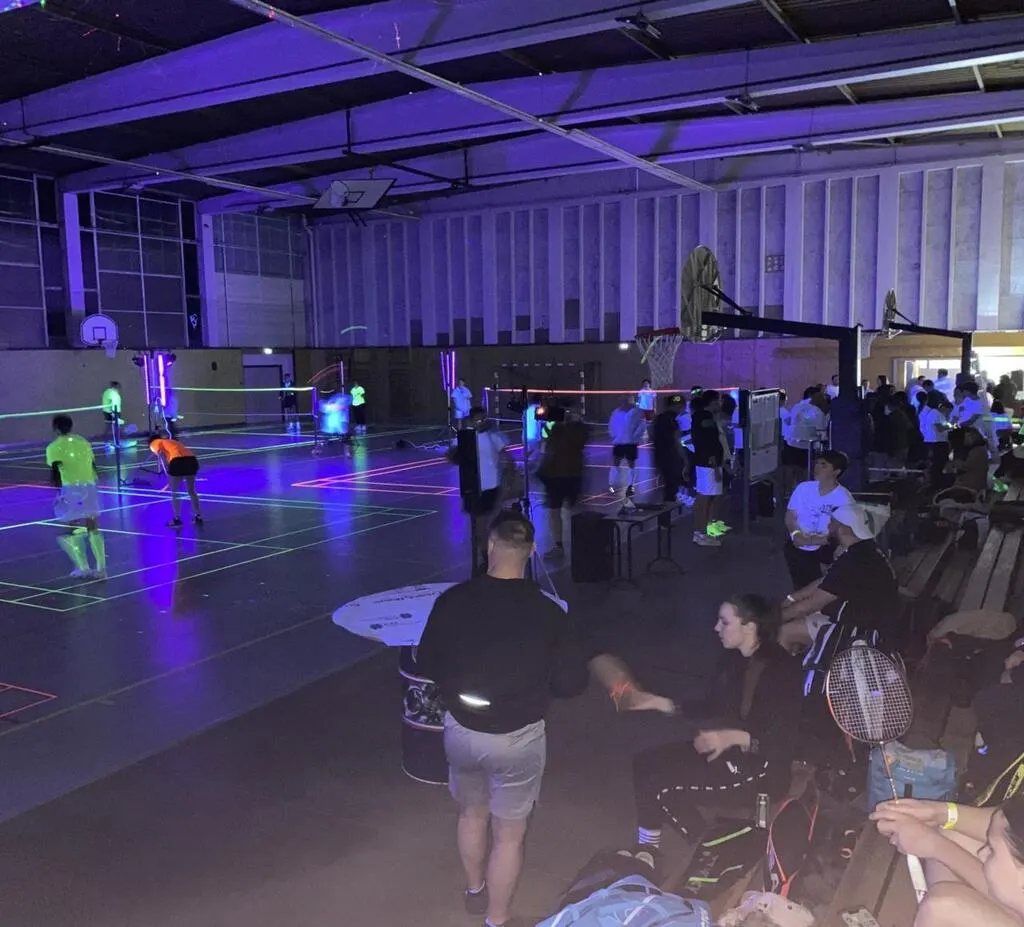 Le blackminton est une version nocturne et lumineuse du badminton jouée sous lumière noire. Les volants, raquettes et lignes du terrain brillent grâce à des couleurs fluorescentes. La soirée est animée par un disc-jockey.