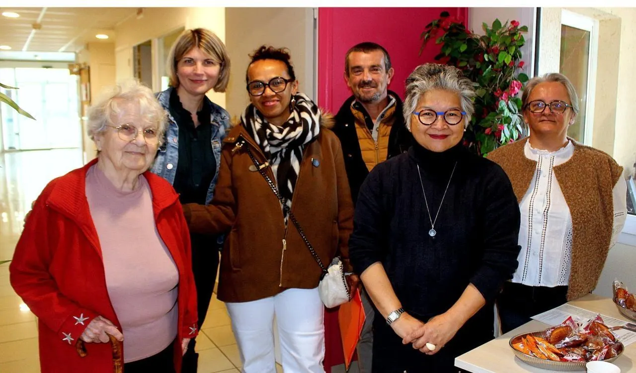 Rencontrés au point d’accueil, de gauche à droite, Marie Thérèse, résidente, Sandra Calzavara, adjointe RH, Farasoa et Jérôme, intéressés par un emploi, Françoise Nguyen, directrice adjointe et Delphine Herrault, cadre de santé. © Le Maine Libre