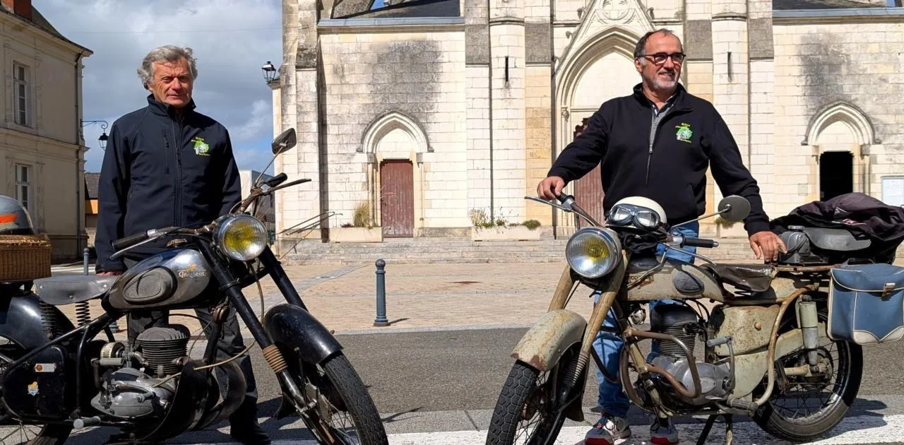 Christian Fourgous et Jean-Pierre Maureille, membres du Rétro motocyclettes sarthoises (RMS), préparent la balade automnale de leur club autour de Mayet. © Ouest-France