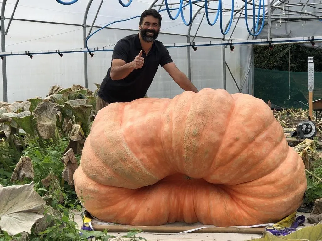 Habitués des records de France et d’Europe pour ses légumes, Medhi Daho, maraîcher bio à Spay dans la Sarthe, repart en campagne avec son potiron géant dimanche 2 octobre 2022,.