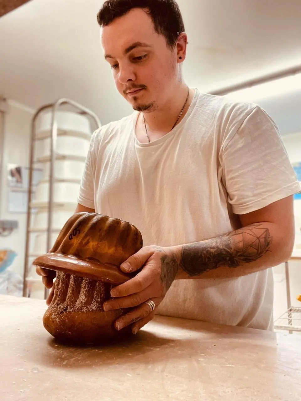 « Dans notre région d’origine, les galettes des Rois briochées ont une autre forme. J’avais aussi envie de proposer une galette plus personnelle. J’ai fabriqué un kouglof à la figue et j’y ai mis une fève », sourit Johan Huhné, 25 ans.