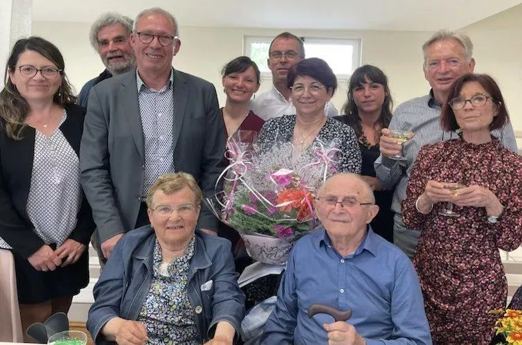 Entourés par le conseil municipal, Monique, 87 ans et Marcel Drouin, 94 ans, sont les doyens de la commune. © Le Maine Libre