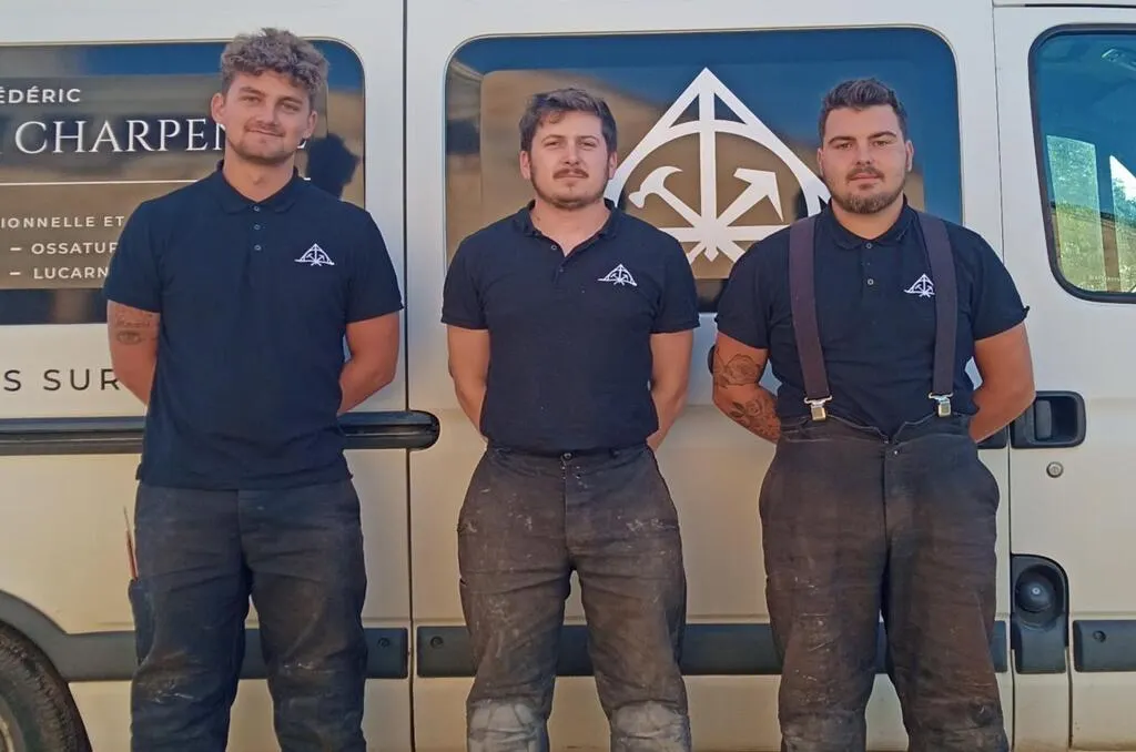 Médéric Lécureur et ses deux salariés, Ginger Missaoui, à gauche, et Vincent Letourneur sont tous trois charpentiers couvreurs. © Le Maine Libre
