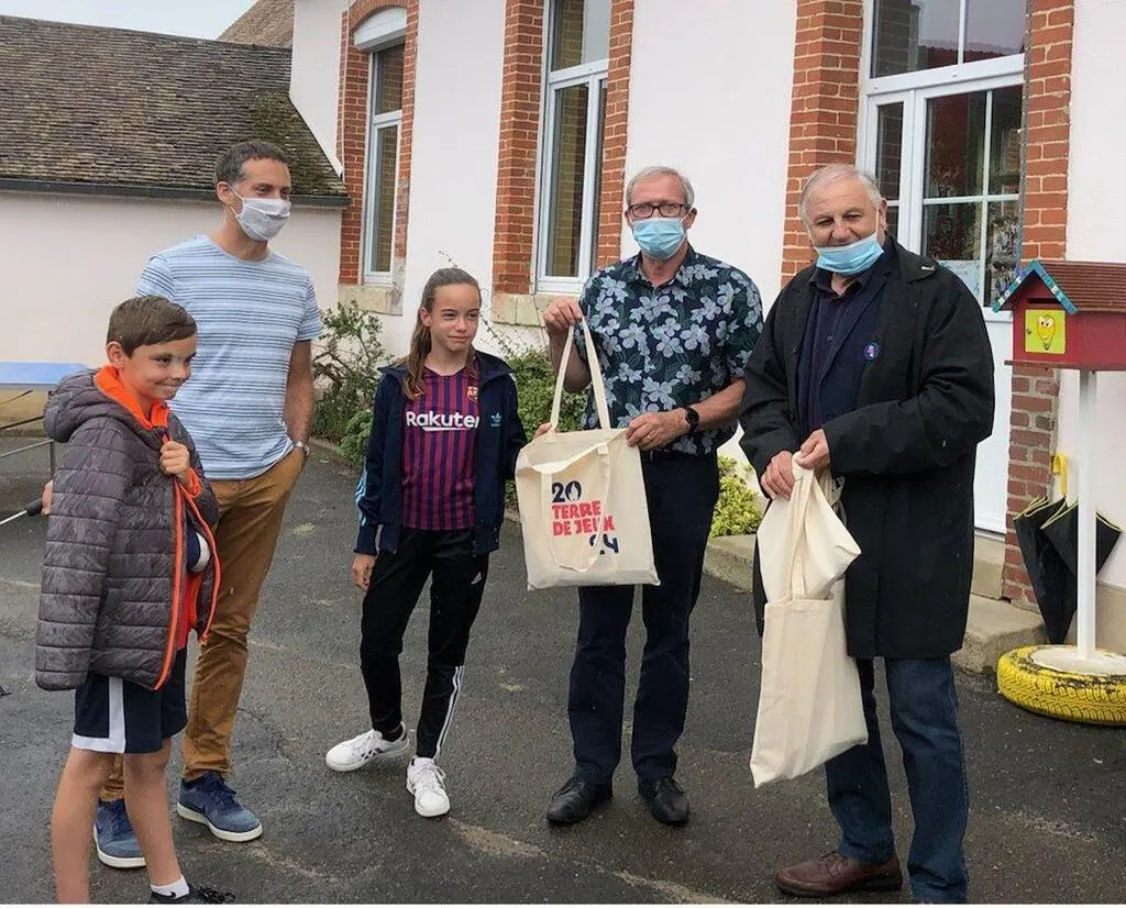 Des représentants du CDOS, ici avec M. Lejeune, enseignant, et Guy Cosme, maire, ont remis aux écoliers des badges et diplômes en reconnaissance de l’investissement de chacun. © Le Maine Libre