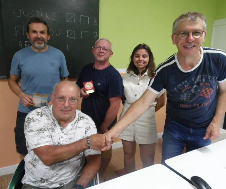 Thierry Bignon (à droite) passe le relais à Francis Toreau, ici aux côtés de Justine Sauvage, nouvelle trésorière, Romain Bellanger et Stéphane Surget, deux des récompensés. © Le Maine Libre
