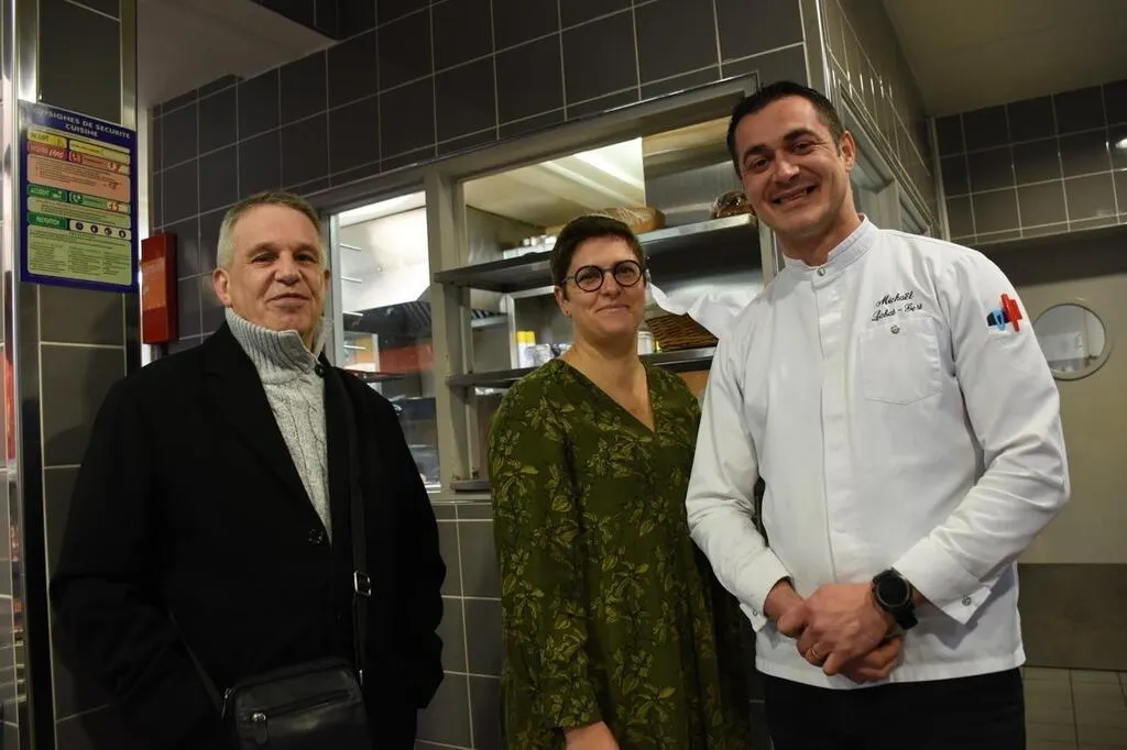 Marie Jaquet, propriétaire du Grand Hôtel de Solesmes, entourée de l’ancien chef Didier Serre (à g.) et du nouveau chef Michaël Labat-Gest. © Photo Le Maine Libre