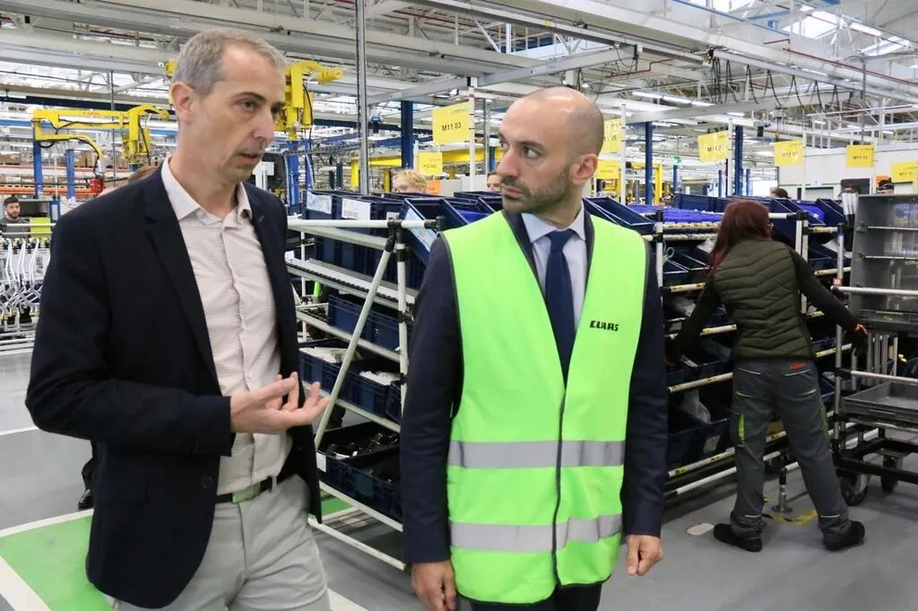 Le ministre Benjamin Haddad (à droite) a visité l’usine Claas tractor, au Mans (Sarthe), qui a reçu une aide européenne pour financer un programme de recherche. © Ouest-France