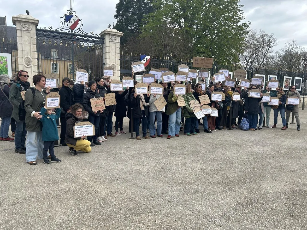 42 enseignants munis de pancartes représentant autant de fermetures de classes à la rentrée de septembre 2026… ce mardi 31 mars 2026, près de 300 enseignants étaient mobilisés pour dénoncer le manque de moyens de l’école à l’université. © Photo Le Maine Libre