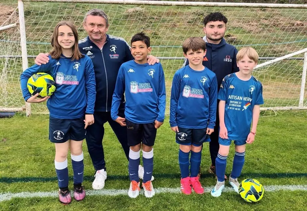 Les jeunes du club de foot qui participeront à un challenge, Laurine, Lino, Malo et Valentin, en compagnie du président, Philippe Georges, et d’Alexandre Levannier, qui sera l’arbitre représentant de l’ESM. © Ouest-France.