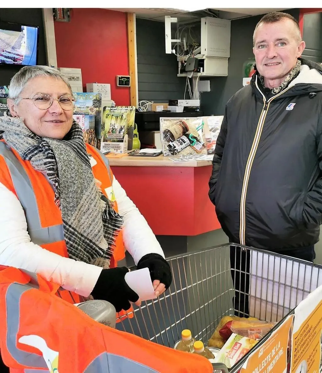 Annie Queuin, élue en charge du CCAS et un représentant d’association lors de la collecte samedi après-midi © Le Maine Libre