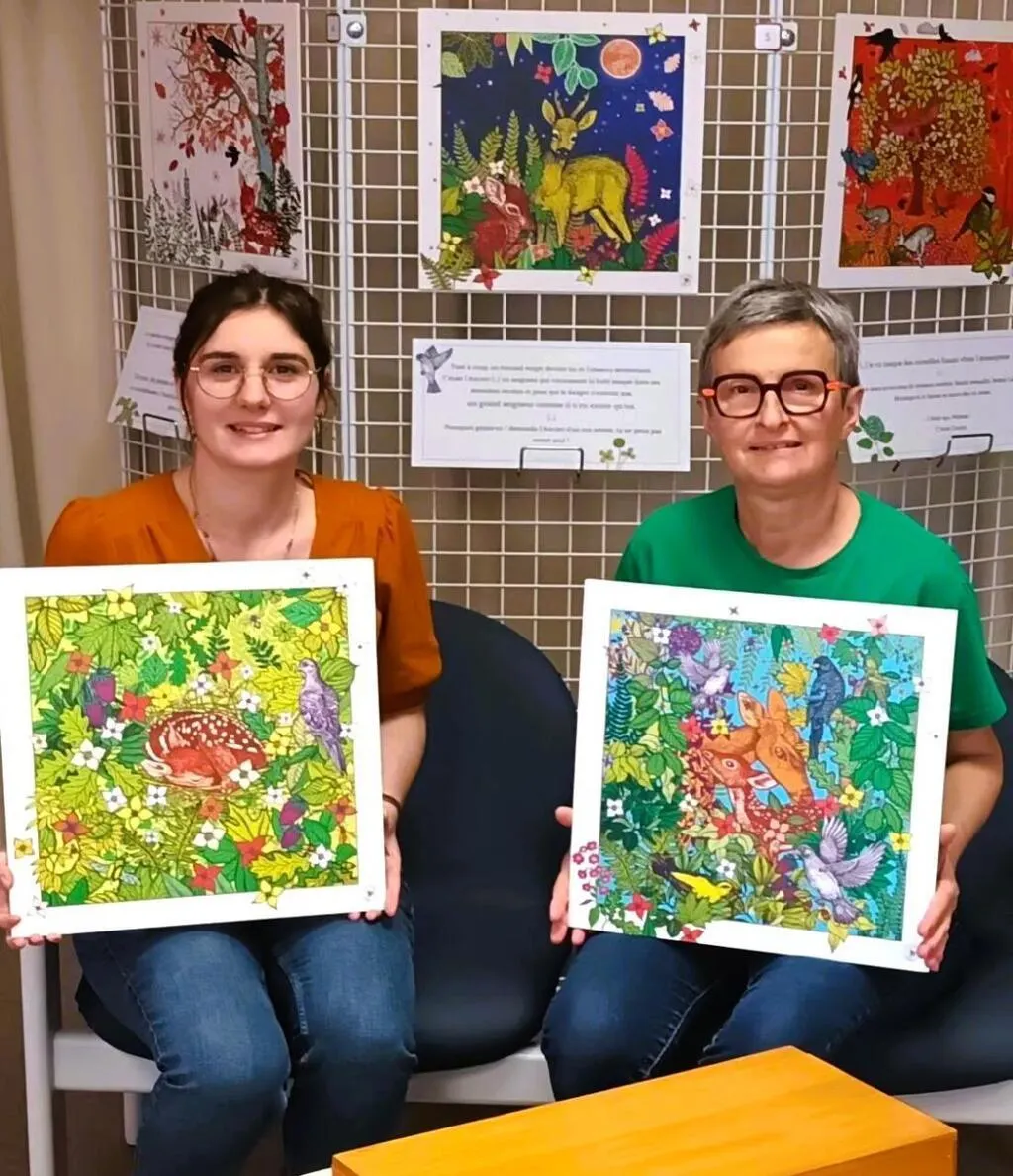 Manon Geslin, responsable de la médiathèque, raconte la belle histoire de Bambi, en compagnie d’Isabelle Cornier, autour d’une exposition de 14 vues de Mickaël Cailloux. © Ouest-France