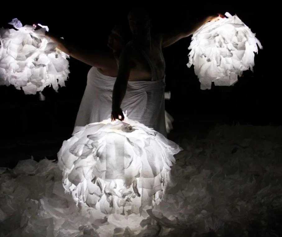 Sur la scène, une multitude de papiers de soie dessinent un paysage blanc, qui respire aux sons du vent, crisse sous la neige, s’éclaire et ondule. Dans cet univers tout blanc, deux personnages vêtus eux aussi de blanc surgissent et invitent à un voyage sensoriel et énigmatique que guident la musique et la lumière. Le papier se défroisse, et une muse se déploie, la mer se déchaîne, des lunes dansent, un dragon apparaît…