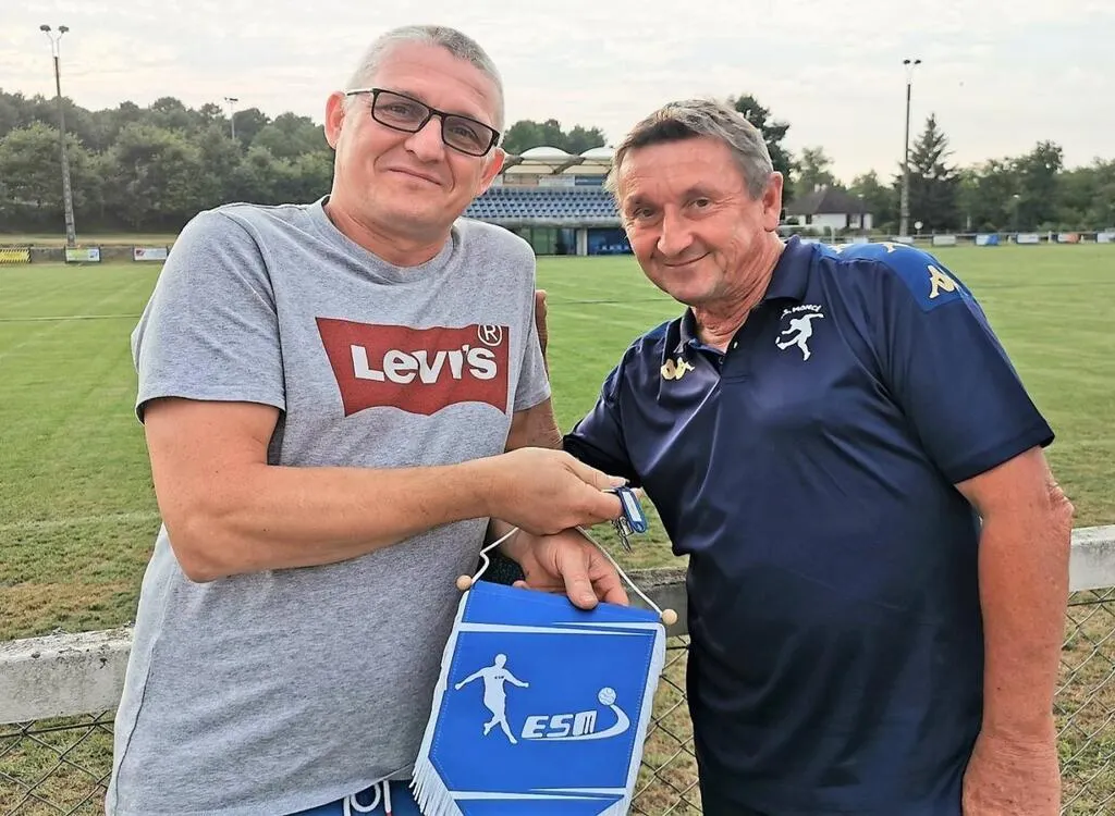 Philippe Georges passe les clés des locaux du club de foot à son successeur, Franck Lacroix, arrivé au club en 1999. © Le Maine Libre.