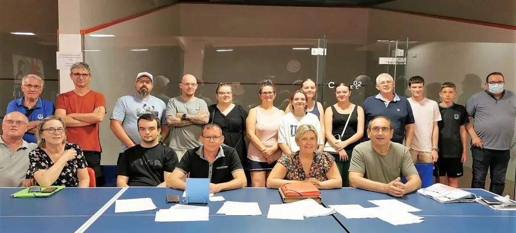 Le nouveau bureau du club de tennis de table, accompagné de membres du comité, du club et de son entraîneur. © Le Maine Libre