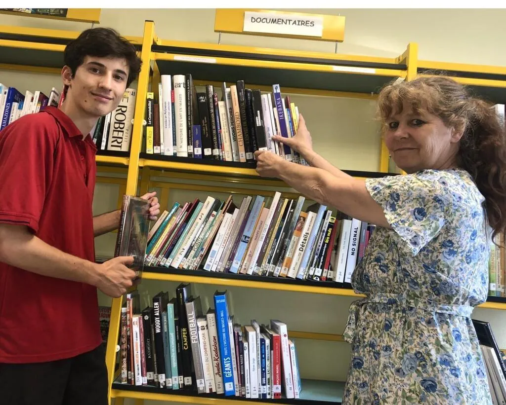 Luke Lecornu, 19 ans, aux côtés de Muriel Bourgneuf, responsable de la bibliothèque. © Le Maine Libre