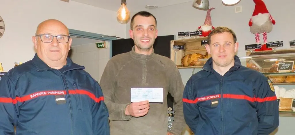 Au centre, Quentin Barbamontes, gérant du petit QJ, remet un chèque de 338 € à l’union départementale des sapeurs-pompiers de la Sarthe, représentée par Pascal Cottereau (à gauche) et Adrien Cottereau (à droite), également président de l’amicale des pompiers de Montmirail-Gréez. © Ouest-France