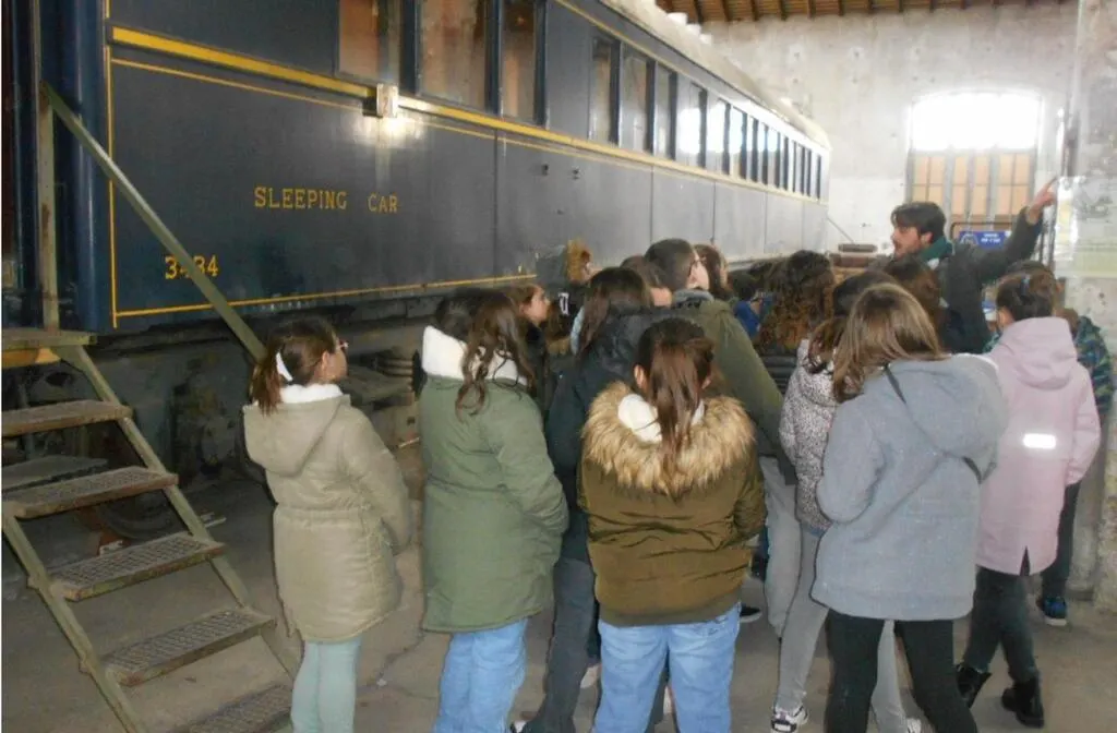 Les élèves devant la voiture lits de l’Orient express avec Paul Cousin, du Pays d’art et d’histoire. © Ouest-France