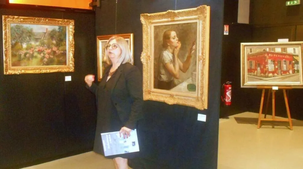 Une superbe peinture de Georges Capon montre une femme qui se maquille. Il y a aussi des bords de mer, une photo en noir et blanc intitulée Sortie de métro, de Jean Bizen. L’on trouve des œuvres plus contemporaines, des figures géométriques et du cubisme, et des livres sur une étagère.