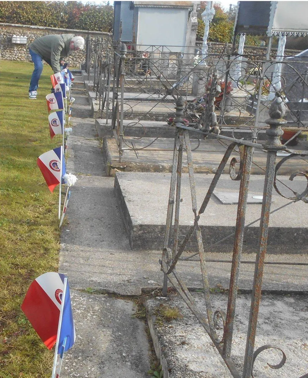 Mise en place par un adhérent des petits drapeaux au pied des tombes des Morts pour la France. © Ouest-France.