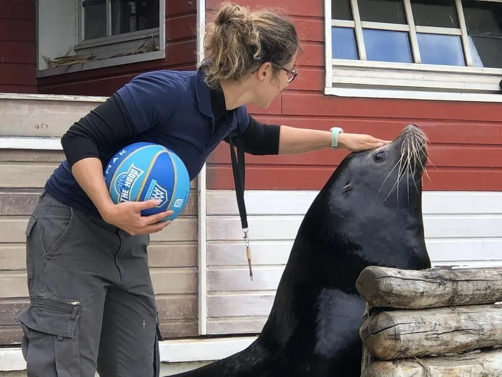 Bérénice, responsable secteur aquatique zoo de La Flèche avec Lucky, otarie mâle 25 ans, photographiés par Le Maine Libre en juillet 2020. © Le Maine Libre