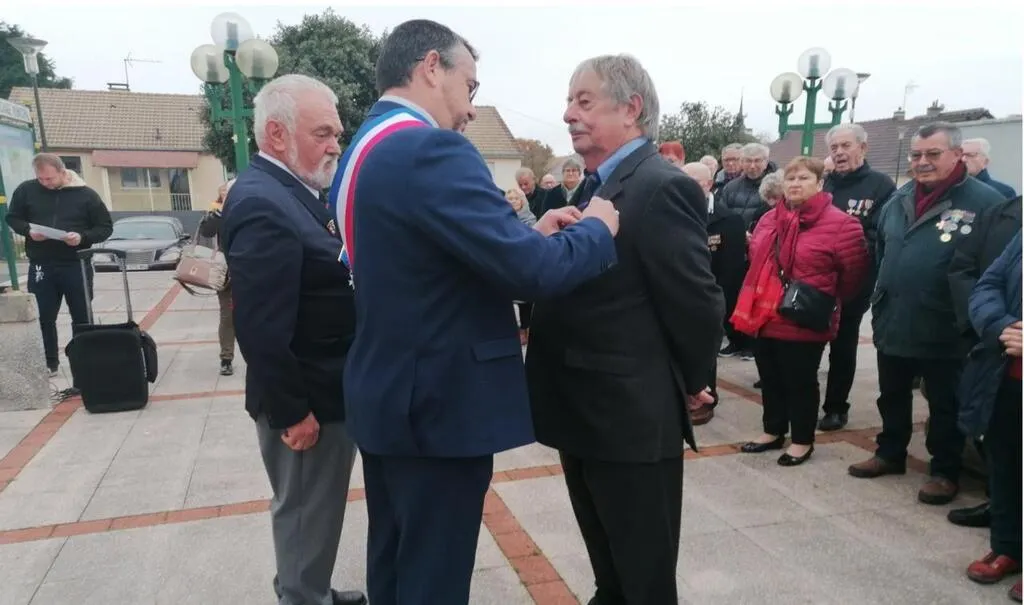 La médaille du Titre de Reconnaissance de la Nation a été remise à André Grangier lors de la cérémonie du 11 Novembre, par le maire, Jean-Yves Lecoq. Le titre de Reconnaissance de la Nation est accordé aux militaires des forces armées françaises et aux personnes civiles qui, pendant au moins quatre-vingt-dix jours, consécutifs ou non, ont participé à un conflit. © Ouest-France