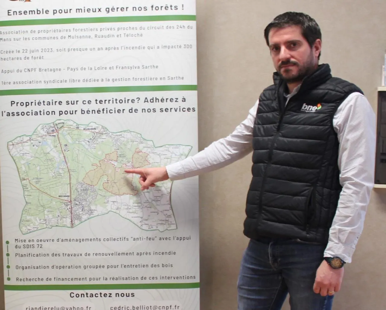 Ludovic Riandière, président de l’association, montre les parcelles qui ont bénéficié de mesures post-incendie des 18 et 19 juillet 2022. © Le Maine Libre