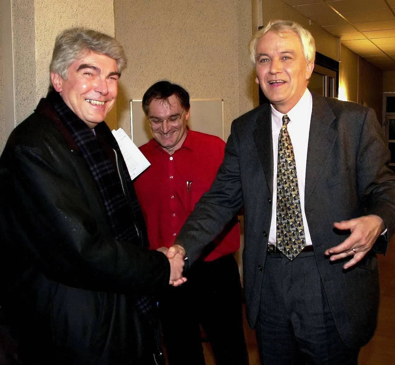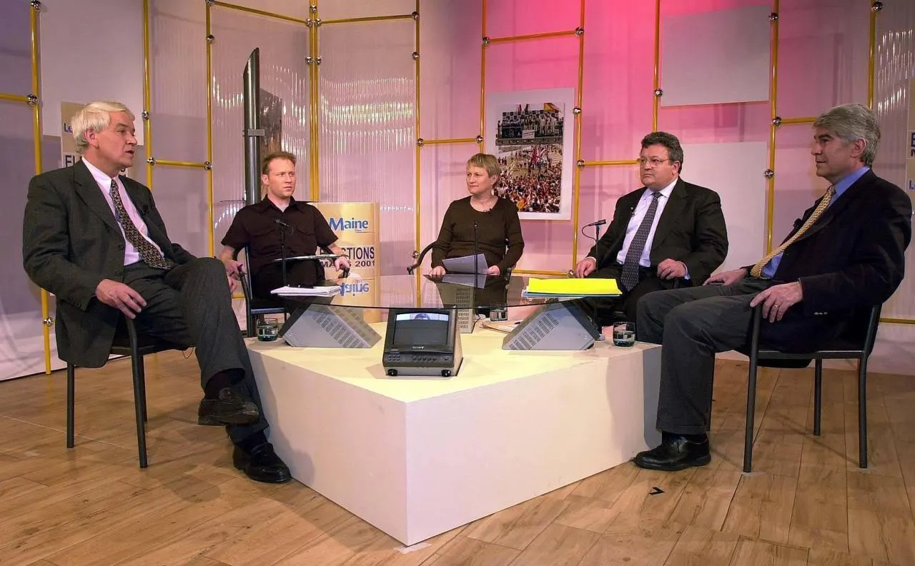 Jean-Claude Boulard et Jean-Marie Geveaux face à face dans un débat animé par Raymond Maudet, rédacteur en chef du Maine Libre, entre les deux tours des élections de mars 2001. © Archives Le Maine Libre