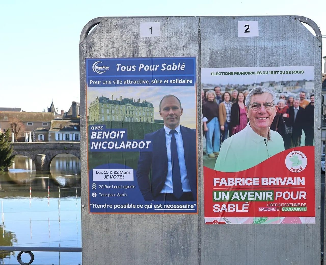 Les affiches des listes de Benoît Nicolardot et Fabrice Brivain pour les élections municipales à Sablé. © Ouest-France