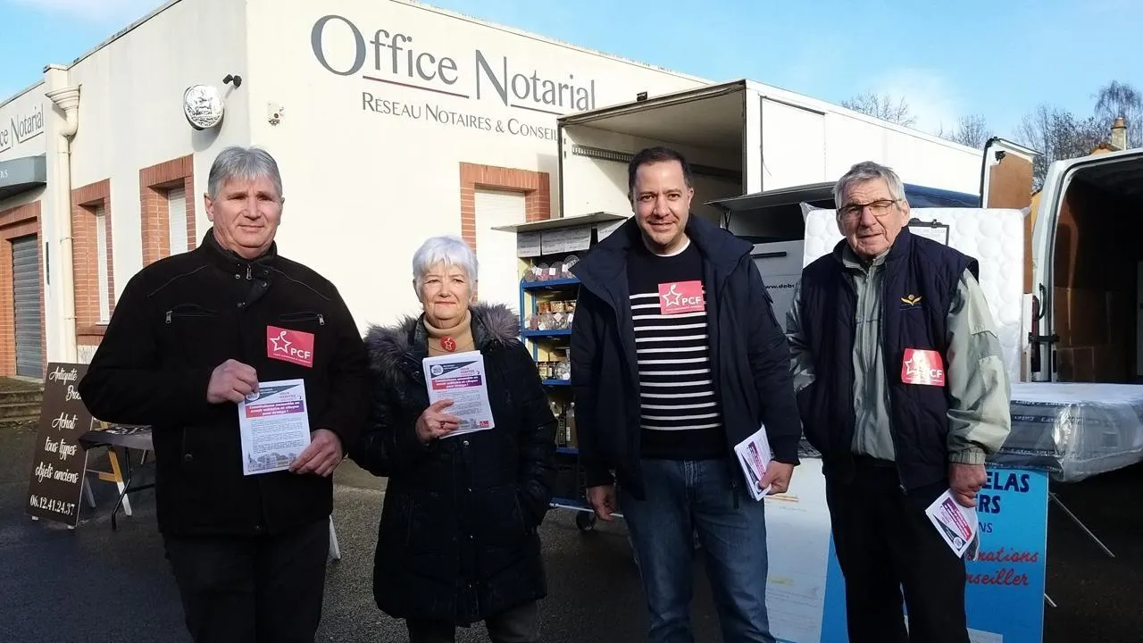 Le parti communiste se lance dans les élections municipales. Samedi 7 février 2026, les représentants du parti ont distribué des flyers sur le marché d’Arnage pour trouver des colistiers. De gauche à droite : Didier Jousse, Martine Goupil, Frédéric Mace et Christian Seery © Ouest-France