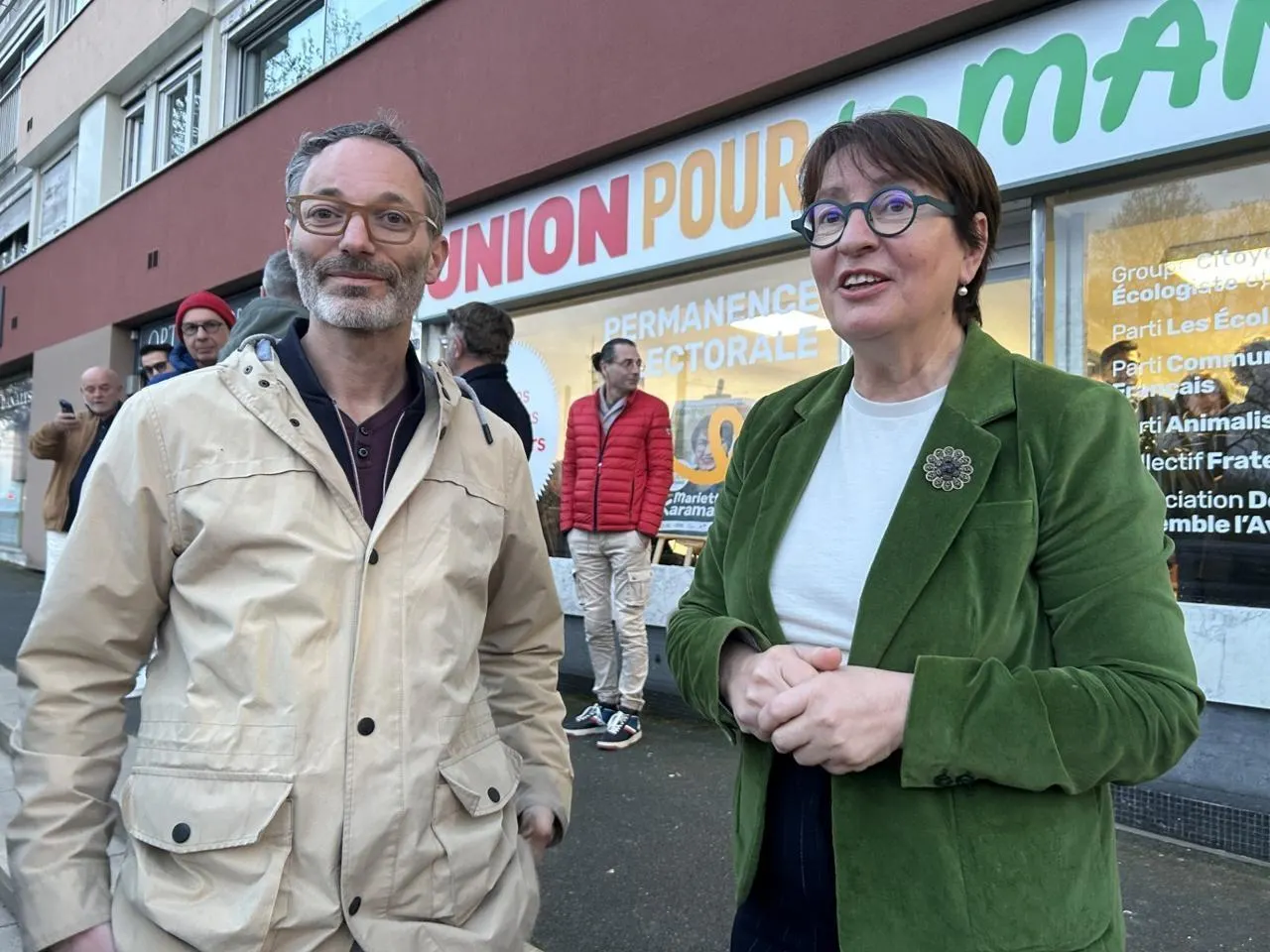 photo  marietta karamanli dimanche soir devant son qg avec l’écologiste samuel guy, n° 2 de la liste « l’union pour le mans ».  ©  le maine libre 1