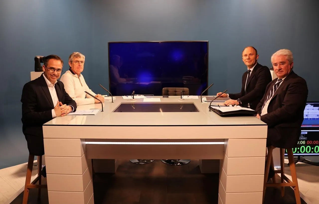 Les quatre candidats saboliens autour de la table du plateau de LMtv Sarthe, ce jeudi 19 mars 2026, au Mans. © Ouest-France
