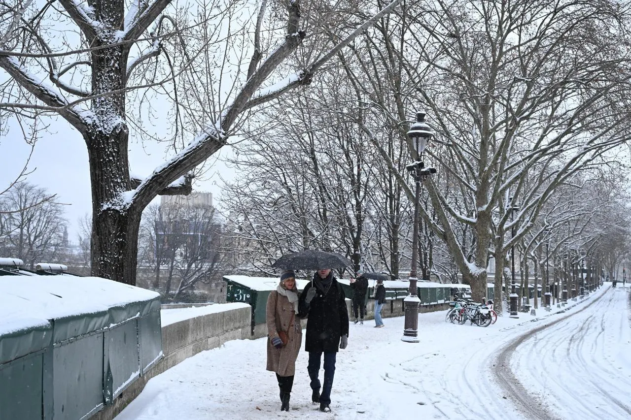 Des piétons marchent sur un trottoir enneigé après de fortes chutes de neige, à Paris, le 7 janvier 2026. © BERTRAND GUAY / AFP