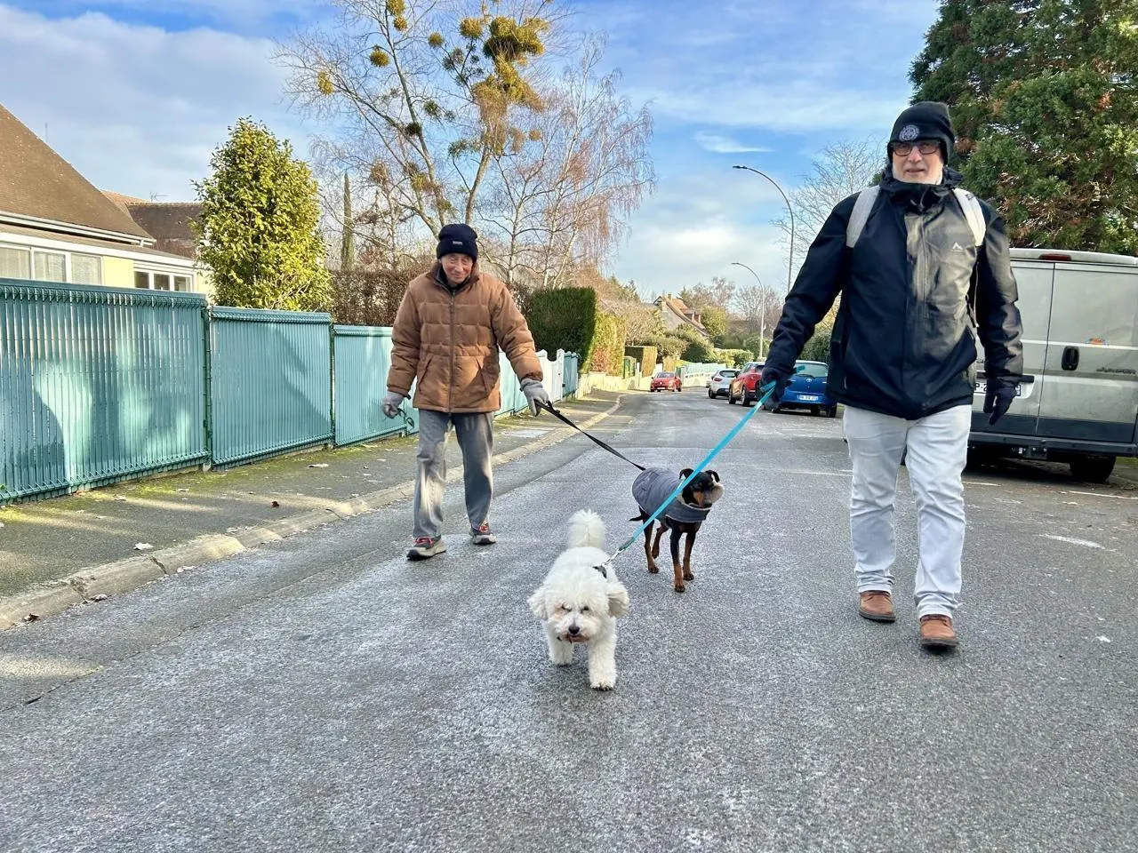 Dans le quartier de Gazonfier, sur les hauteurs du Mans, certaines chaussées étaient encore blanches ce lundi 5 janvier 2026. La neige attendue en fin de journée va les rendre encore plus glissants. Ce qui ne décourage pas Gérard et Dominique. © Le Maine Libre