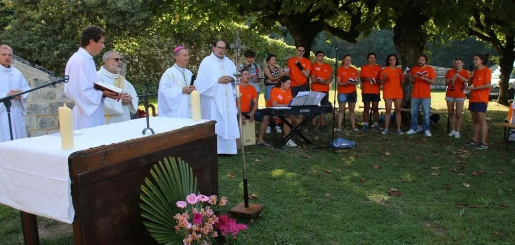 Un office religieux célébré sous les tilleuls par l’Évêque Jean-Pierre Vuillemin du diocèse du Mans. © Le Maine Libre