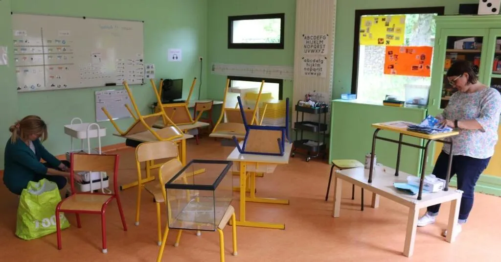 Jeudi, à l’école Jean-de-la-Fontaine. Mélodie Poirier et Solène Soulis, professeurs des écoles, ont procédé à la désinfection et à la mise en place du mobilier pour l’accueil des élèves. © Le Maine Libre