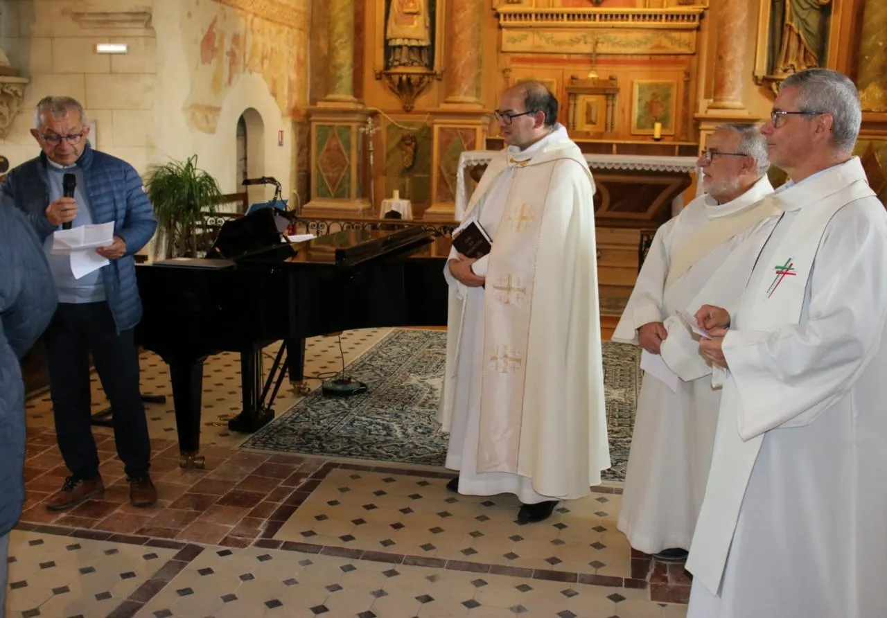 Étaient présents Benoît Pierre, vicaire général, représentant Jean-Pierre Vuillemin, évêque du diocèse du Mans, Emmanuel Jamin, curé de la paroisse de Mamers et du Saosnois et Jean-Claude Théotime, diacre.  Nous devons cette Å“uvre à Virginie Berthier, maître verrier de Nogent-le-Rotrou (Eure-et-Loir), que je salue. Cette Å“uvre est une suite logique dans la mise en valeur de cette église communale… Cette restauration a été soutenue par les trois dernières municipalités. Près d’un million d’euros y ont été investis. Je souhaite remercier l’association Joseph-Roussel pour son soutien précieux dans ce projet, et tout particulièrement son président, Jean Fernandez, pour son engagement et sa générosité ainsi que le frère Gilles. Un grand merci également à tous les bénévoles qui ont donné de leur temps, de leur énergie et de leur cÅ“ur pour que ce vitrail voie le jour. Votre travail a été essentiel, et nous en sommes reconnaissants. Que ce vitrail soit pour chacun un signe de paix, de foi et d’espéranceÂ