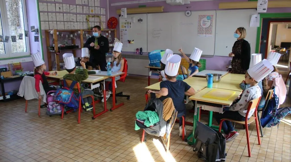 En présence de Meggie Martin, professeure des écoles, et coiffés d’une toque gracieusement offerte par Laurent Olivier, les enfants ont pu passer à des épreuves pratiques au cours de cet atelier. © Ouest-France