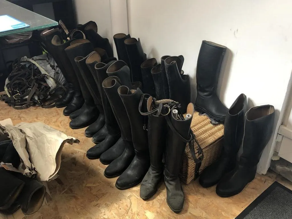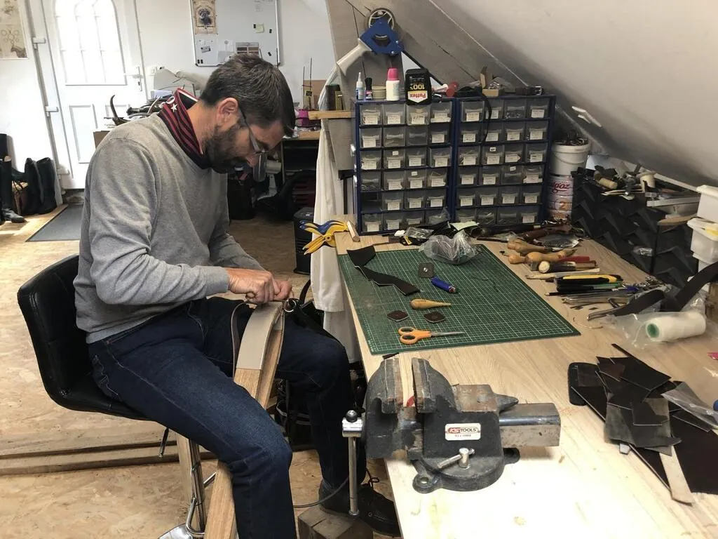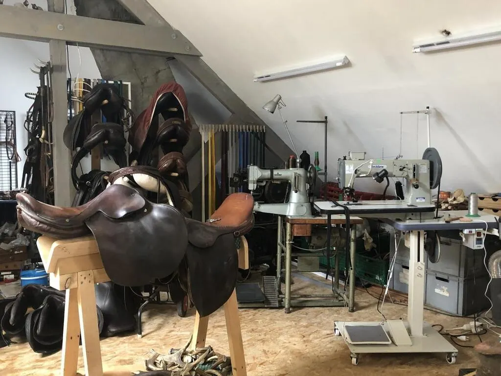 Entre les selles, les ceinturons et autres pièces nécessaires à la pratique de la chasse à courre qui remplissent l’atelier, Sébastien Régnier ne manque pas de travail. © Ouest-France
