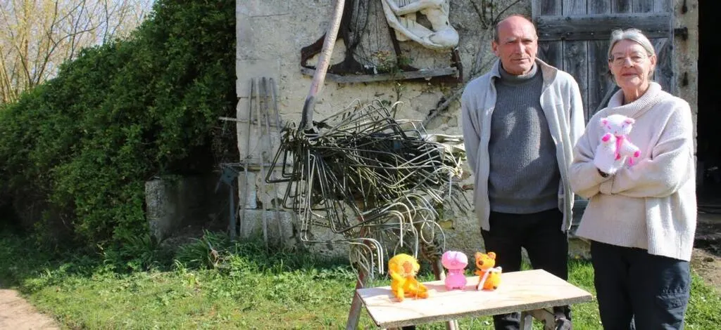 Sophie et Alain Bouvet, devant les figurines réalisées au crochet et des sculptures, dont l’autruche, qui a valu le prix Louis Derbré à l’artiste. © Ouest-France